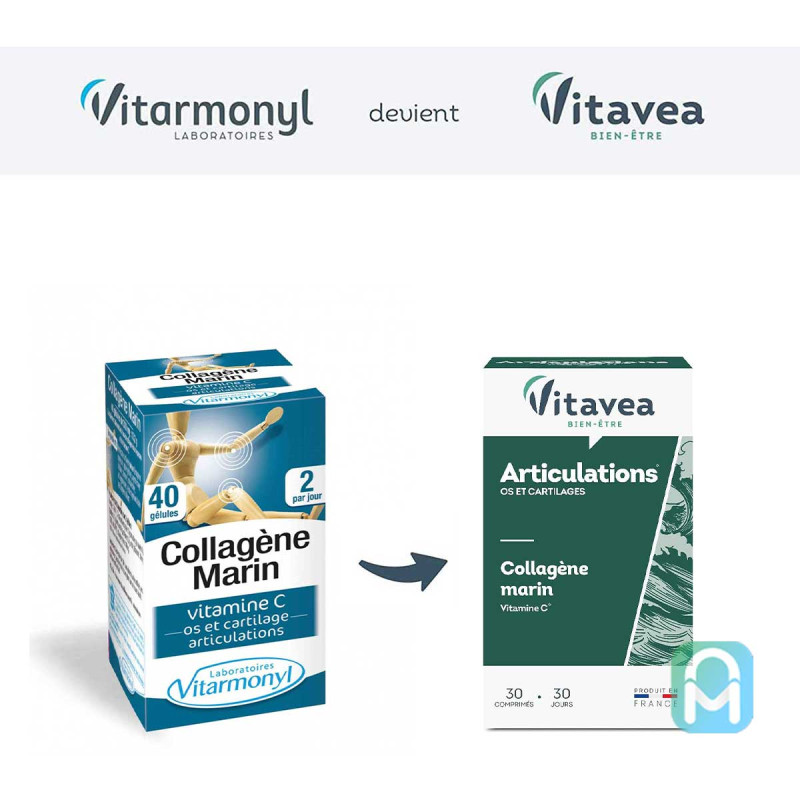 VITAVEA Articulations Os et Cartilages est un complément alimentaire à base de collagène issu de poisson et de vitamine C.