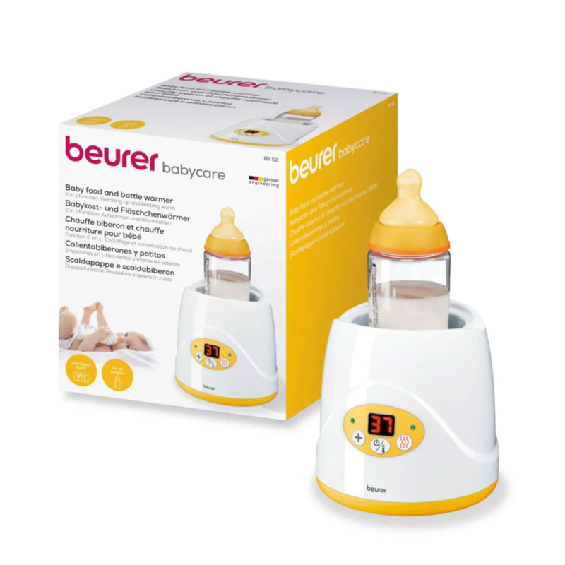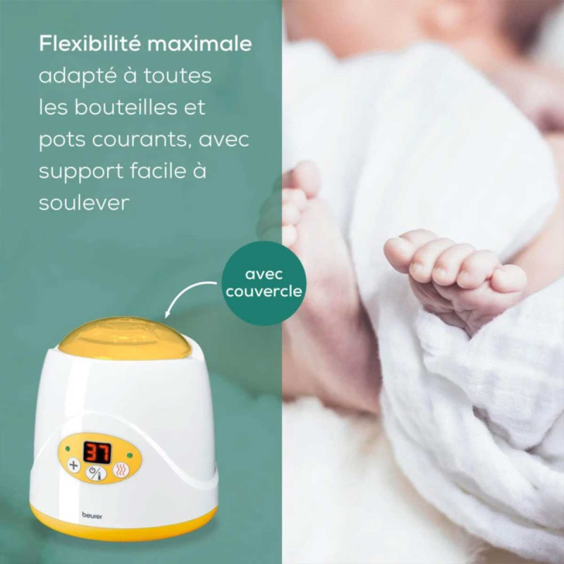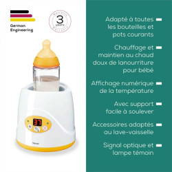 Le chauffe-biberon et chauffe-aliments BY 52 de Beurer permet de réchauffer les aliments pour bébé de manière douce et continue et de les maintenir à la bonne température jusqu’au moment du repas. Adapté à tous les types de biberons, il facilite la vie des parents grâce à son écran LED clair et à ses accessoires lavables en lave-vaisselle pour une hygiène optimale.