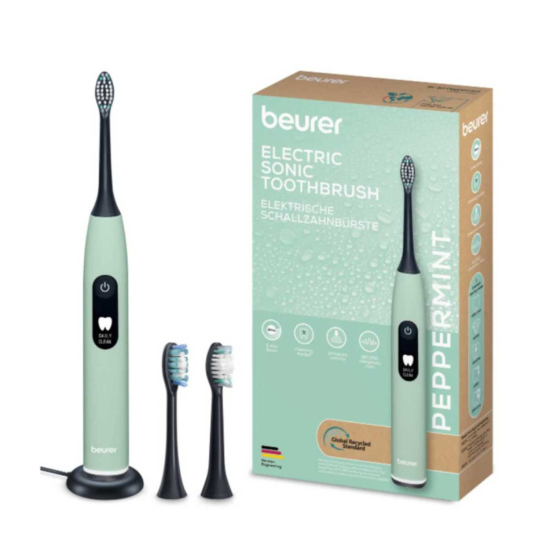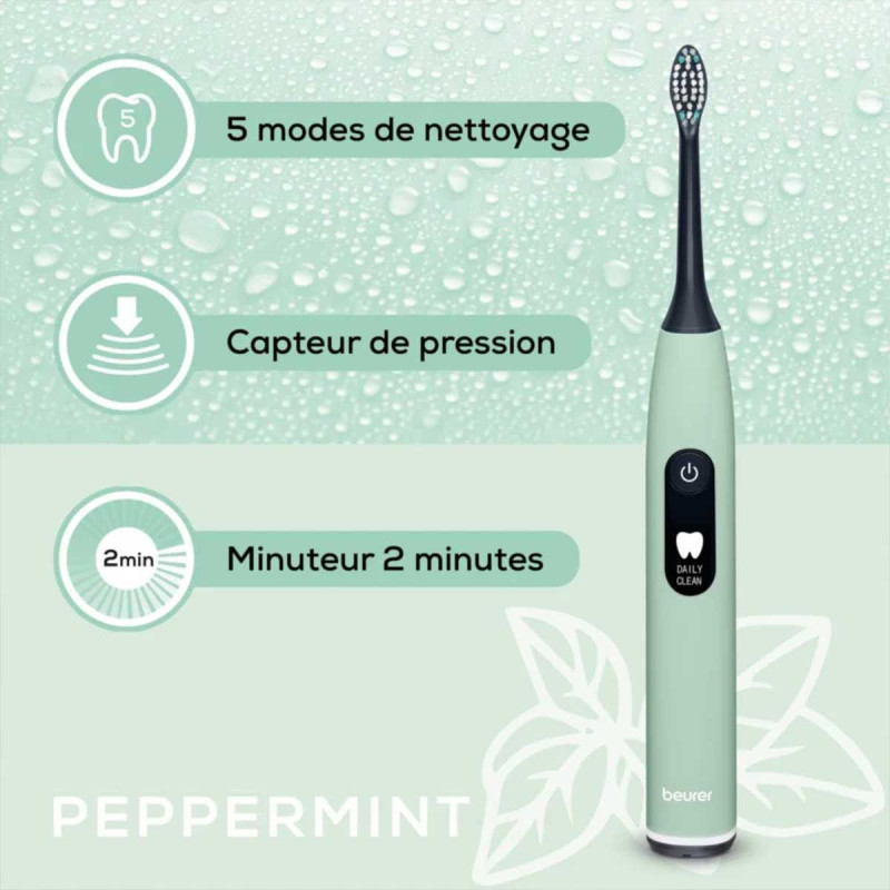 Des soins dentaires doux mais en profondeur : Avec 80 000 oscillations/min et capteur de pression intégré, la brosse à dents électrique SC 50 Peppermint nettoie vos dents en douceur et élimine efficacement la plaque dentaire et les impuretés. 5 programmes s'adaptent à vos besoins, tandis que l'affichage de la durée de nettoyage et le minuteur à quadrants acoustiques vous aident à garantir une hygiène buccale optimale. Durable grâce à un boîtier en matériau 100 % recyclé, pratique avec plateau de charge magnétique et batterie puissante – dans le kit de démarrage avec 2 têtes de brosse à dents de dureté différente.