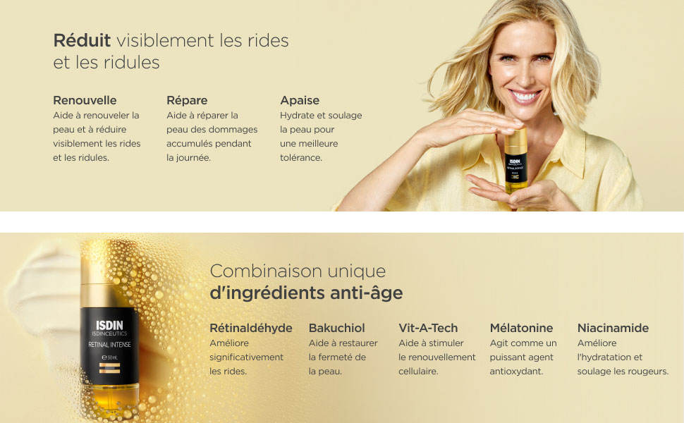 Le rétinaldéhyde, le bakuchiol et la Vit-A-Tech aident à renouveler en douceur la surface de la peau et à réduire les rides et les ridules. La mélatonine, un antioxydant, répare les dommages cutanés accumulés pendant la journée, tandis que la niacinamide hydrate et réduit la sécheresse associée aux rétinoïdes, soulageant ainsi la peau pour une meilleure tolérance.