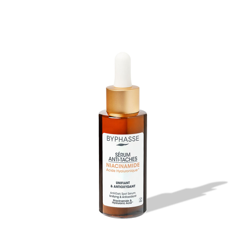 Le sérum anti-taches Byphasse contient de la niacinamide. Aux pouvoir unifiant et anti-oxydant, ce sérum agit sur les imperfections de la peau pour unifier le teint, affiner le grain de peau et prévenir l’apparition des nouvelles taches.