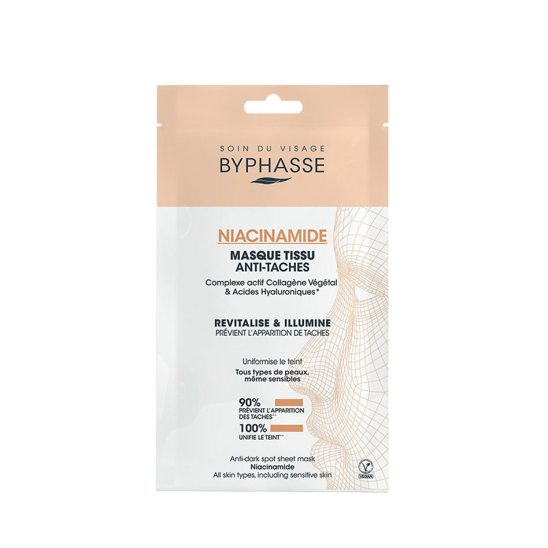 Le masque en tissu Skin Booster à la Niacinamide prévient l'apparition des taches, revitalise et illumine la peau tout en uniformisant le teint. Les résultats sont visibles directement après l'application.