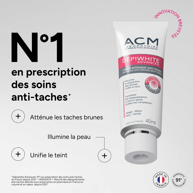 Le soin Dépiwhite Advanced de Laboratoire ACM est recommandé pour les différents types d’hyperpigmentation : taches de vieillesse (lentigos séniles), les taches brunes type masque de grossesse et taches de soleil (lentigos actiniques). Cette crème a été pensée pour toutes les peaux sujettes aux taches brunes. Elle contient 91% d'ingrédients d'origine naturelle. Elle favorise la disparition des taches brunes et unifie le teint.