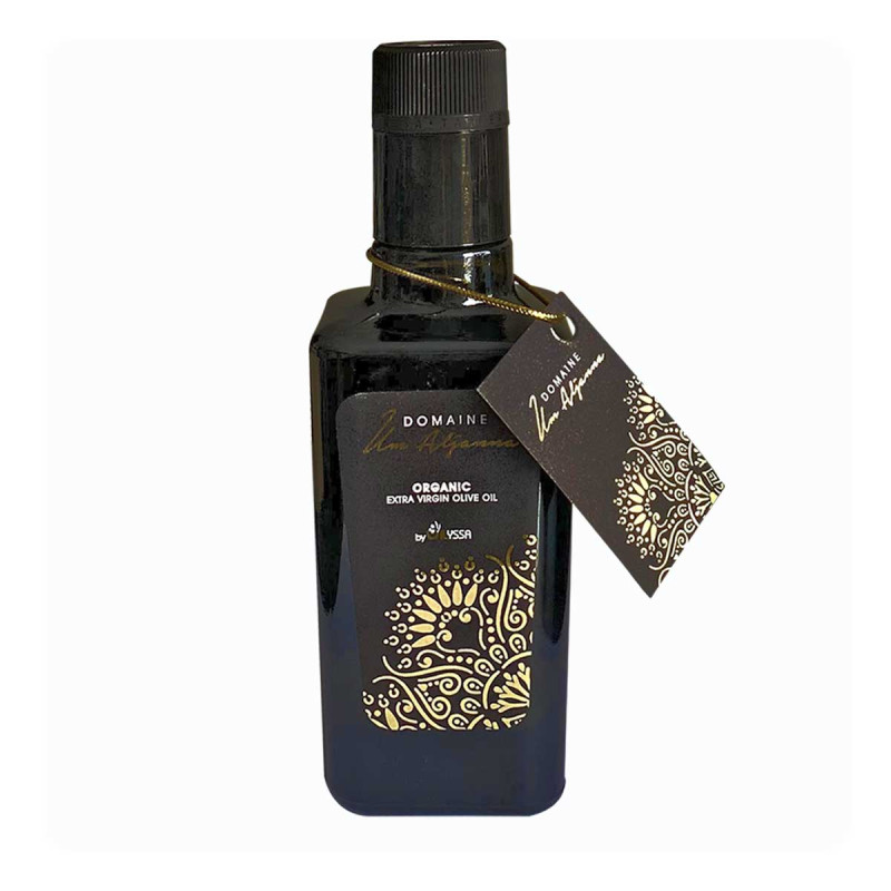 La marque tunisienne de huile d'olive extra vierge est cultivée et fabriquée dans le prodigieux domaine d'Um Aljannah au Nord du Bizerte précisément à Ghazela prés du lac d'Ichkel.