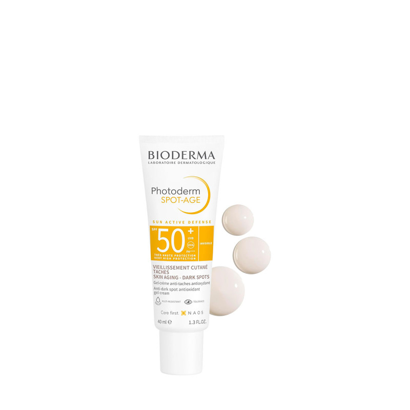 BIODERMA Photoderm SPOT-AGE SPF 50+ associe le pouvoir de 3 actifs reconnus par les dermatologues [Vitamine C - Vitamine E - Centella asiatica] et de filtres solaires pour une protection large spectre (UV - Lumière Visible - Infrarouges) et crée un soin qui prévient et favorise la réduction des signes visibles du photovieillissement (taches, rides, perte de fermeté).