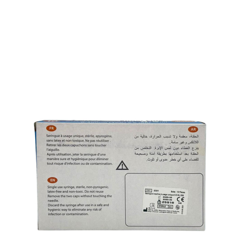 La Seringue 0.5ml à Insuline avec une aiguille est une seringue à usage unique, stérile et apyrogène en conformité avec les normes internationales.