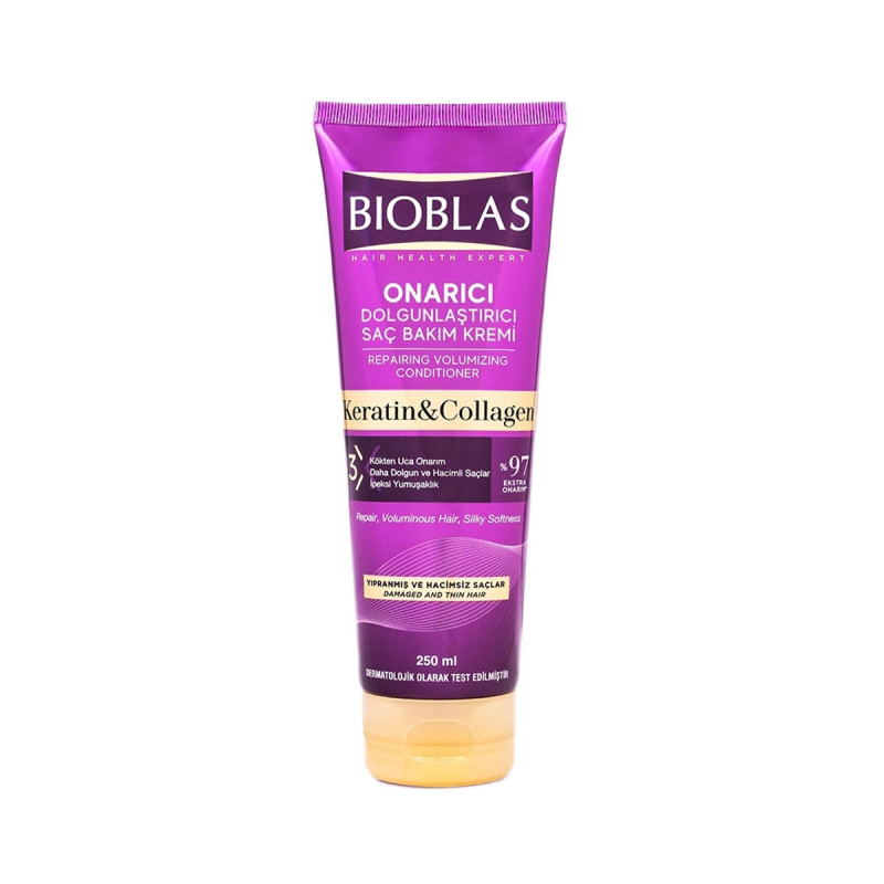 Cet après shampoing à la keratine et collagène revitalisant, réparateur et fortifiant de Bioblas contient de la kératine hydrolysée, du collagène et un complexe à base de plantes breveté B19.